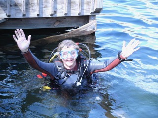 Day One went well. The first challenge was to descend and sit on a small wooden platform forty-five feet down at the bottom of the quarry. There I had to flood my mask, remove it, put it on again and blow out all the water. Lana stayed close offering encouraging sign language. The next challenge was discovering how to remove my buoyancy jacket and tank, like an underwater Houdini. Lana continued to re-assure with eye and hand gestures. Once safely strapped back into the jacket the next task was to remove the regulator from my mouth (with the air supply!), throw it away and then grope behind my shoulder, find the hosepipe the regulator was attached to, put it back in my mouth and breathe again. Phew! And, Lana was still hovering alongside.